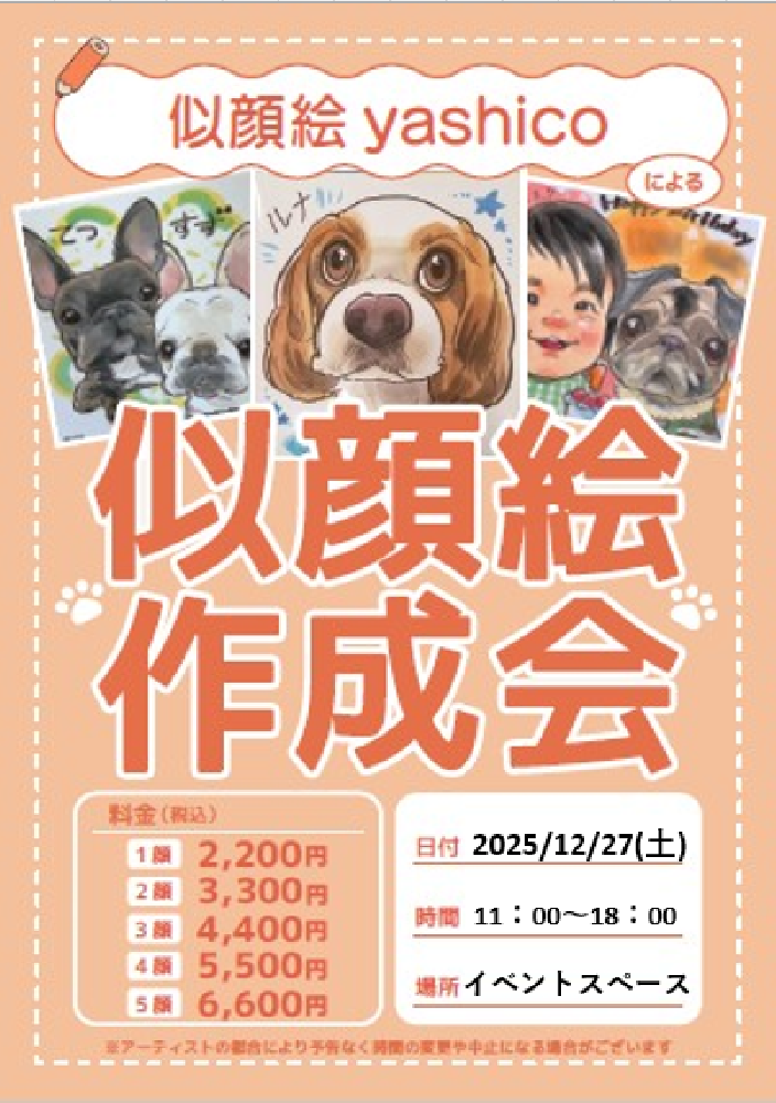 | ワンちゃん、ネコちゃんの似顔絵作成会を開催します! 大切なご家族の似顔絵を可愛く描いてみてもらってはいかがでしょうか! 飼い主様もご一緒に参加できます! 事前予約も承りしております! |